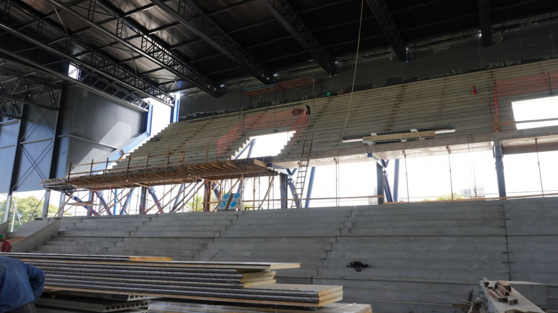 Sobre el sector de tribunas, se trabaja en la ejecución de completamiento de estructura de hormigón, sobre el premoldeado finalizado. Además, se ejecuta el piso llaneado de hormigón en la nave principal.
