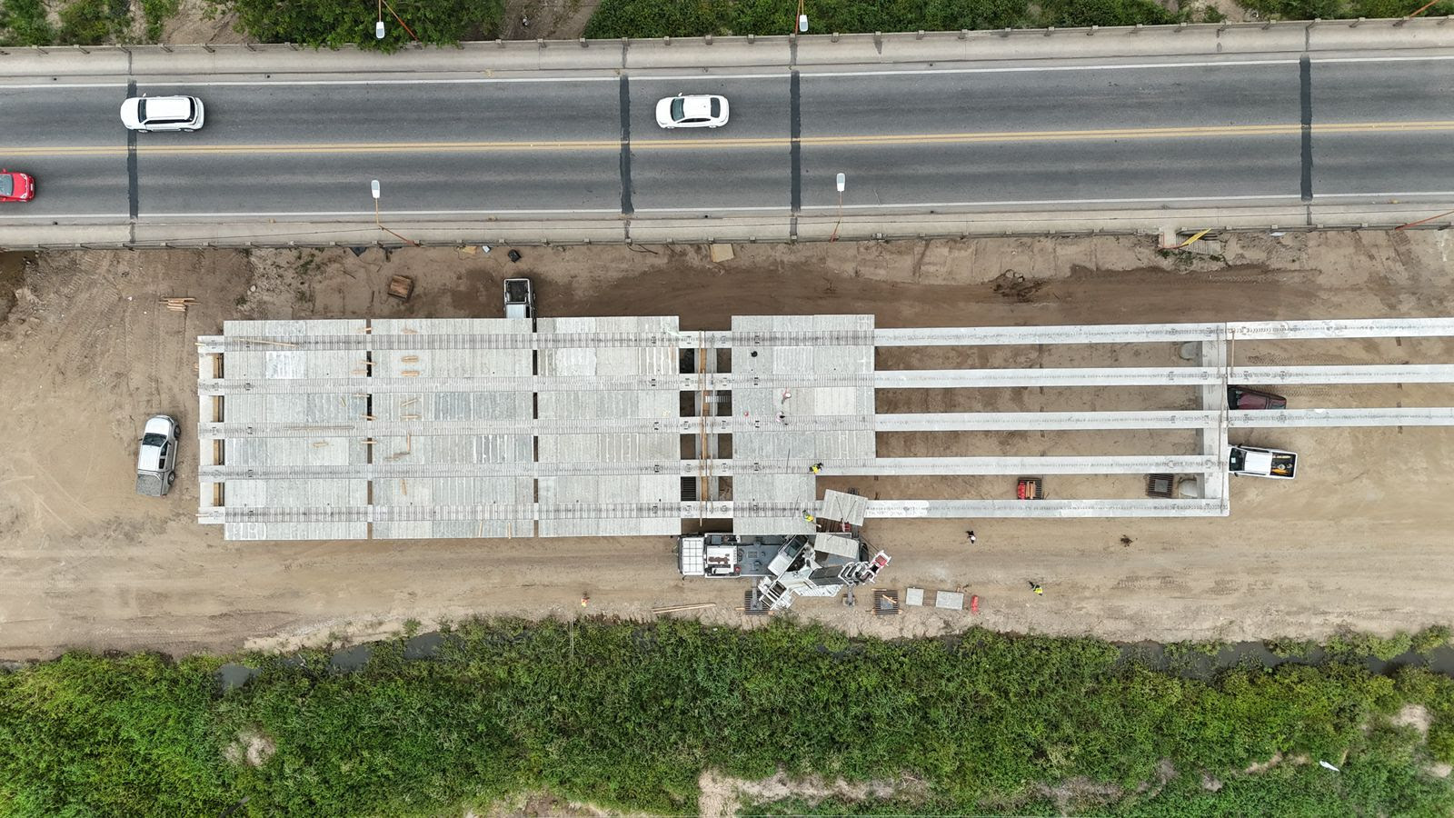 El nuevo puente provincial, ya alcanza un (30 %) de avance, con 15 vigas colocadas, que completan 3 vanos, y sobre los que se están colocando las prelosas.